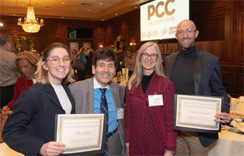 Previous winners of the Elizabeth Frances Calabrese Scholarship Award for outstanding PR students are shown celebrating in December, 2019. Left to right are co-recipient Alice Scharf; Past PCC President Dominic Calabrese; Columbia College Chicago Communication Department Chair Suzanne McBride; and co-recipient Nathan Branch.